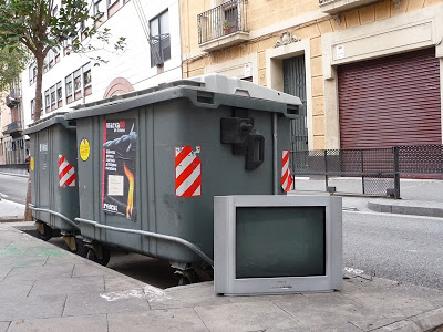 Un minuto, tan sólo un minuto más tarde, aparece en escena una furgoneta blanca, merodea también por los alrededores. Se detiene frente al container. En su interior, un par de cabezas contemplan al individuo que sigue estudiando cómo cargará con el televisor, de no menos de 32 pulgadas y tan grande como aquellos viejos Black Trinitron. El conductor, un hombre que no debería superar los treinta años sacude la cabeza. Su acompañante, una mujer que, a juzgar por su aspecto, debe ser su madre, le pregunta sin pudor alguno al que sigue con el televisor si se lo va a quedar él. La respuesta afirmativa de éste genera una reacción de contrariedad en la pajera de la furgoneta. Han llegado tarde. Mejor que sigan merodeando. Suben las ventanillas, arrancan y desaparecen convertidos en una flamante mancha blanca más allá de aquella vieja rambla que años atrás veía transcurrir un añejo torrente. Al otro lado de aquella realidad, el que se queda con el televisor, visto el interés que suscita, decide que ha de actuar con rapidez. Lo intenta cargar, falla las dos o tres primeras veces que lo levanta a peso del suelo. Abulta lo que no está escrito. A la cuarta lo consigue, no sin penas, tantas que comprende que es imposible que lo consiga acarrear muchos metros. Chasquea la lengua e improvisa una solución, decide esconderlo detrás de una caseta de electricidad.